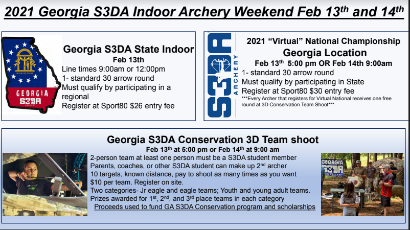 | Posted: 19 Jan 2021 09:33 AM PST The news you all have been waiting for!!! Make Feb 13 and 14th an S3DA archery weekend. State will be shot on Feb 13th.Archers have the option to register for the “virtual” national line for either 13th at 5pm or 14th at 9am. They only shoot one line for Nationals. The 3D Conservation Team shoot will run concurrently to the National event and can be shot 13th at 5pm or 14th at 9am.Each team must have at least one S3DA member. The other participant can be coach, parent, or other S3DA member. Everyone that registers for “Virtual” Nationals receives one free round on 3D Conservation range. ![]() ![]() |